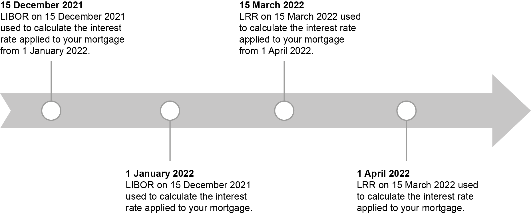 The amendments to your mortgage agreement took effect from 1 January 2022, but interest on your mortgage won’t begin to be calculated using LRR until your quarterly interest period ends for the first time in 2022.