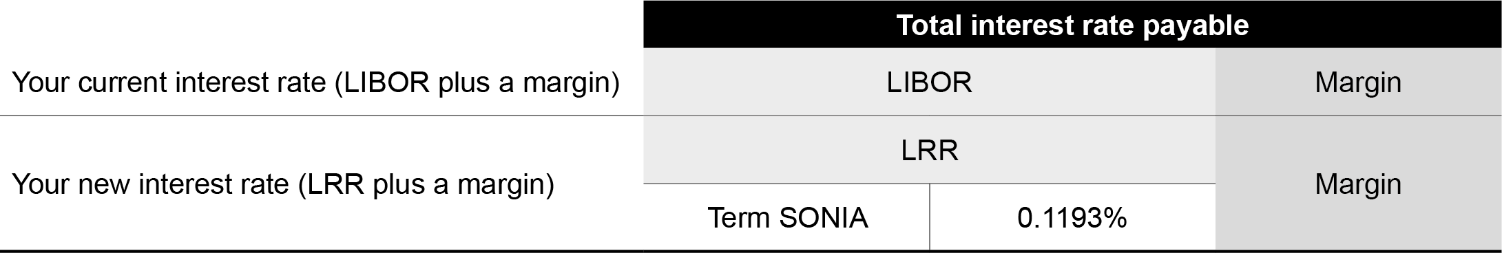 LRR replaced LIBOR as the basis for calculating the interest rate you pay on your mortgage with effect from 1 January 2022. Following the switch, the interest rate charged on your mortgage is LRR (which is 3-Month Term SONIA plus the adjustment of 0.1193%) plus the existing margin stated in your mortgage agreement.